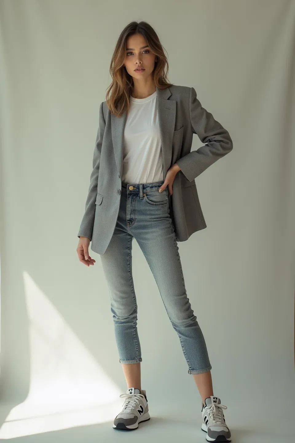 In the studio setting, we see how a gray blazer creates an effortlessly cool monochromatic moment. The outfit's strength lies in its simplicity: a well-cut gray blazer, white t-shirt, and light wash cropped jeans, anchored by white and gray New Balance sneakers. This look demonstrates how tonal dressing can make sneakers feel intentionally sophisticated rather than casually thrown on.
